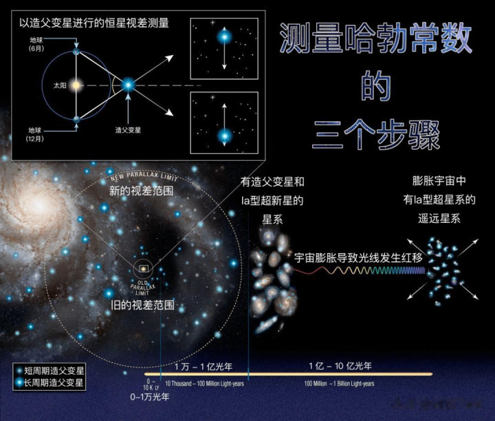简单说,哈勃张力就是科学家测宇宙膨胀速率时,两个主流方法得出的数对不上,一个测近邻天体,得出大概73的数值,一个测宇宙大爆炸的余晖,只得出67左右。